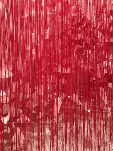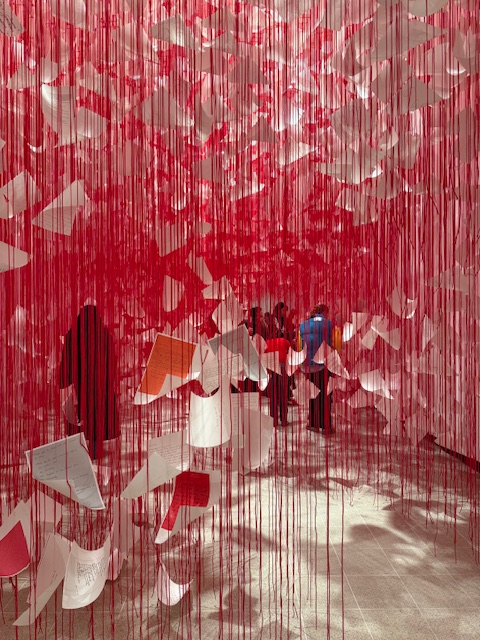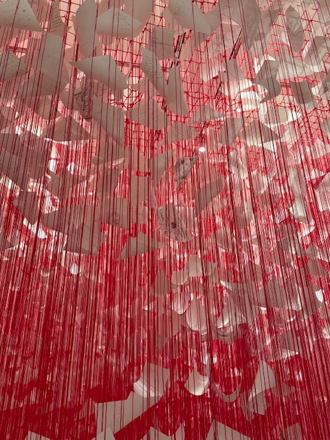 The following room consists of hanging red thread with floating papers of good intentions, gratefulness and memories. You weave your way through this space, exploring the messaging of sentiment as you go. I found this installation quite poignant, again finding a human connection with these faceless people.
